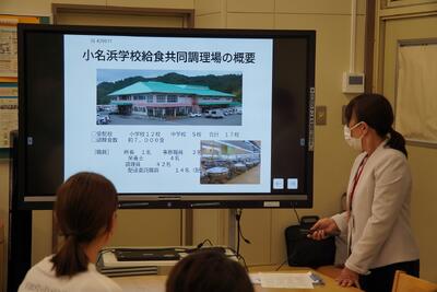 まずは、栄養士の先生から、給食をどのように作っているのかを教えていただきました。