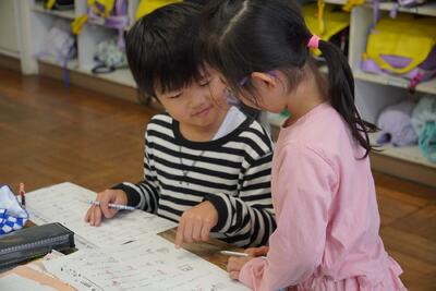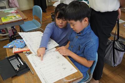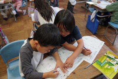 「ことばをたのしもう」を音読したり「は・を・へ」を正しく使えるか、プリントを使って友だちと話し合って確認したりしました。