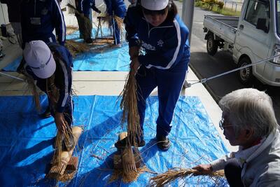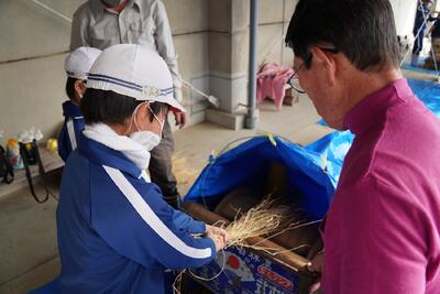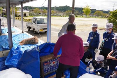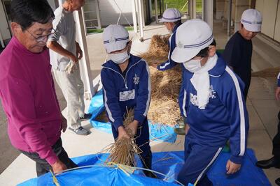稲は、稲刈り後、ハセ掛けをして乾かしていたので、この雨で濡れてしまっているのでは?と思ったのですが、そこは抜かりありません。「田んぼの学校応援団」代表の方と5年担任で、実施予定日の前日のうちに、子どもたちが脱穀を体験する分の稲を、濡れない体育館の軒下に運んでおいてくれました。