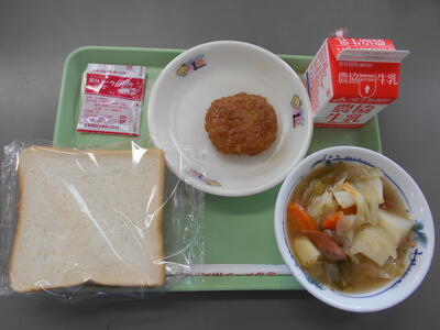 食パン、牛乳、メンチカツソースかけ、ポトフ、ストロベリーミルメークです。