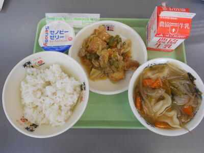 ごはん、牛乳、あつあげと豚肉のみそいため、スープぎょうざ、セノビーゼリーです。
