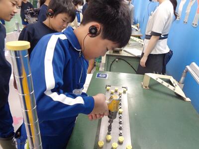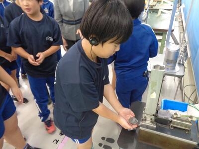 工場内では、様々な機械の音が響く中でも説明の声が聴きやすいよう、イヤホンを付けて見学しました。