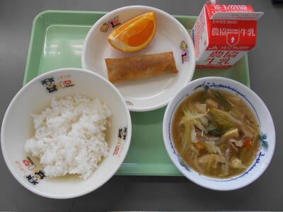ごはん、牛乳、野菜はるまき、八宝菜、オレンジです。