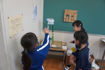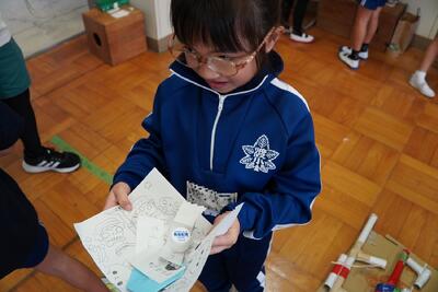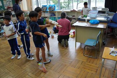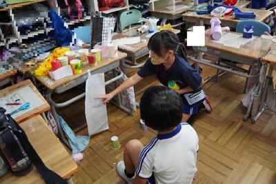 2年生が生活科「うごくうごくわたしのおもちゃ」で、輪ゴムやなどの力を使って動くおもちゃづくりをしてきましたが、それが発展し、「そのおもちゃを使って1年生を楽しませよう。」ということになりました。