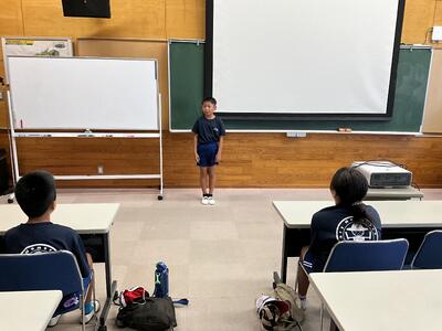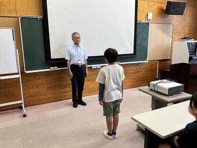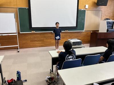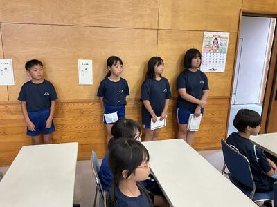 児童代表挨拶では、海浜オリエンテーリングでは、みんなと協力して全てのポストカードを見つけることができたこと、昼食や朝食ではマナーを守って最後まできちんと食べれたこと、そして友達との絆が深まったことを所員の方へお伝えしました。