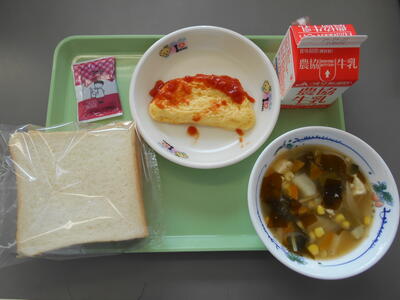 食パン、マーシャルビーンズ、牛乳、オムレツトマトソースかけ、わかめと野菜のスープです。