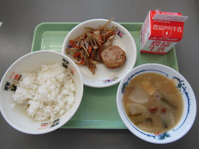 ごはん、牛乳、ごもくきんぴら、とりつくね、なめことだいこんのみそ汁です。