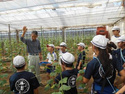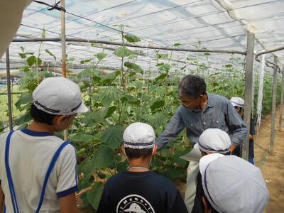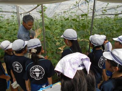 本日、3年生が社会科の見学学習で、近くのキュウリ農家を訪ねました。