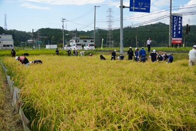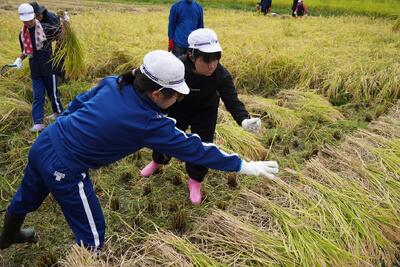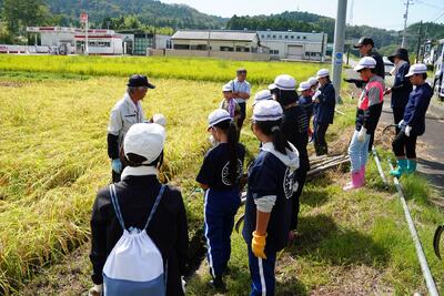 「田んぼの学校応援団」の皆様と、ご都合のつく5年生保護者にサポートしていただきながら、5年生が稲刈りを体験しました。