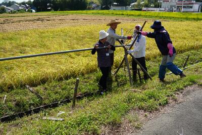 今回も、事前に「田んぼの学校応援団」の皆様が、畔の草刈りをしたり、はせ掛けをするための棒を設置してくださったりと、子どもたちが限られた時間内で気持ちよく活動できるよう事前に準備をしてくださっていました。本当にありがたい限りです。