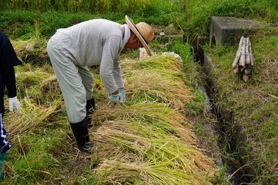 もうすぐ秋のお彼岸だとは思えない暑さの中、子どもたちは汗をふきふき、水分もこまめに取りながら、稲刈りをがんばりました。
