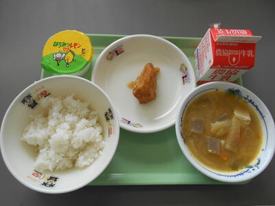 ごはん、牛乳、鶏肉のアップルソースかけ、けんちん汁、はちみつレモンゼリーです。