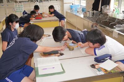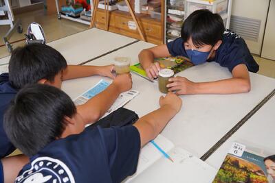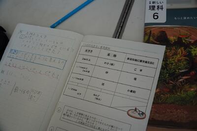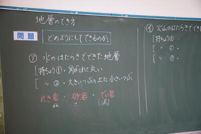 子ども達は、机にへばりつくように視線を層ができている容器に合わせ、水のはたらきでできた地層をじっくり観察していました。そして、大きな粒の上に小さな粒の層ができることや、粒の大きさによって、れき岩、砂岩、泥岩となることも学んでいました。