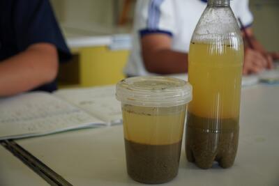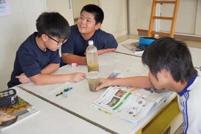 前もって校庭から集めた土と水を混ぜて泥水にしたものを作っておき、それらが時間の経過によって複数の層に分かれることを観察しました。