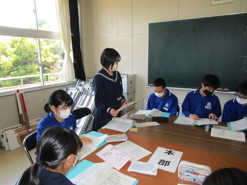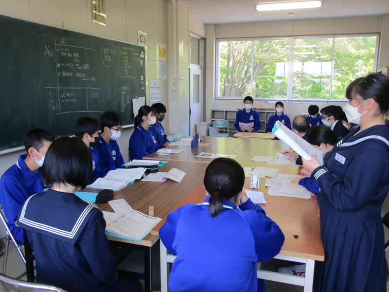 2022年5月10日 13時35分昼休みに、生徒会本部役員、各常任委員長、議長担当が生徒会室に集まり、原稿の読み合わせを行いました。約2年間コロナ禍の影響により、体育館での生徒会総会をなかなか実施できませんでした。その影響で、会進行の流れや手順を知っている生徒もいません。会の進行を一つ一つ確認していきました。生徒会総会の仕組みは、大人になっても必要となる知識ですし、その経験によってさまざまな力が身についていきます。。今年は、2年前の活動に戻すとともに生徒会活動の活性化に取り組んでいきます。明日の生徒たちの活躍に期待しています。