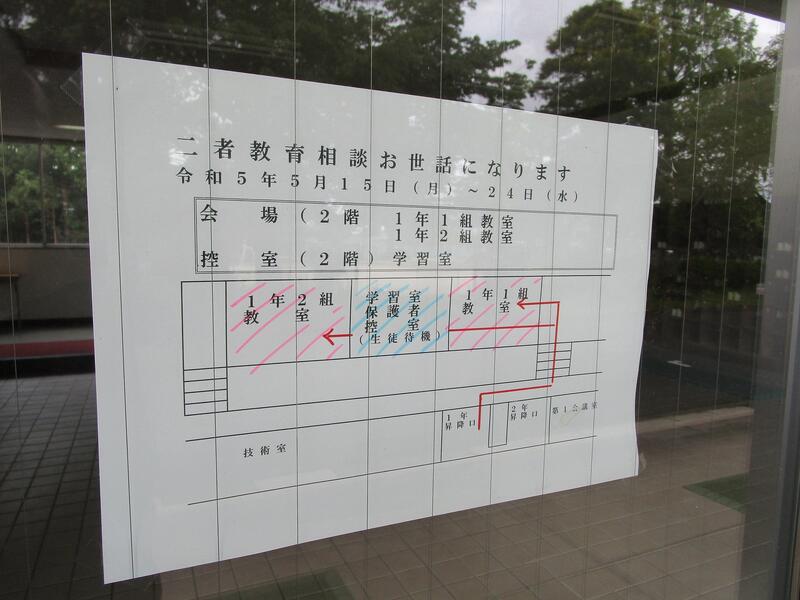 1年生の保護者の方には、面談での来校が初めてとなる方もいらっしゃるかと思い、生徒昇降口に掲示してある案内を載せておきます。各学級とも、面談会場はお子さんの教室となります。校舎の周りやテニスコートで部活動を行っている生徒もおりますので、お車でご来校の際は、十分お気を付けください。