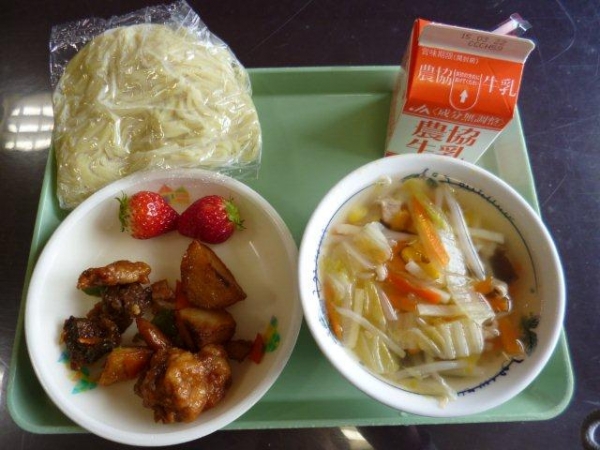メニュー 中華ソフト麺 塩味スープ 鶏肉とポテトの揚げ煮 いちご 牛乳