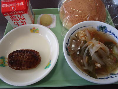 2022年3月9日 19時05分今日の給食は、メロンパン・ハンバーグ・いわきとトマトのスープ・ひとくちゼリーでした。