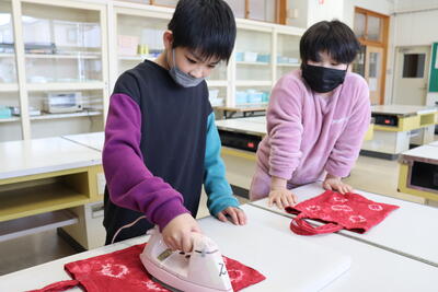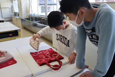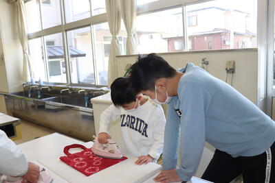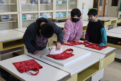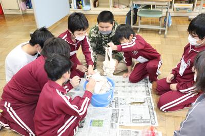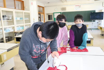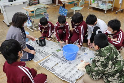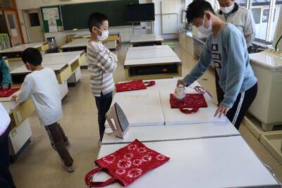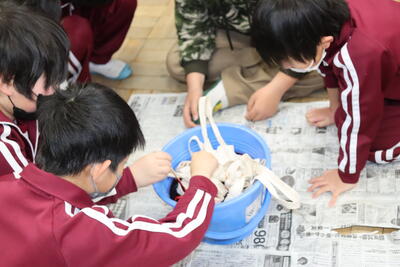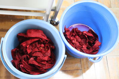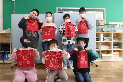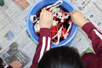 2024年3月8日 16時13分さくら学級では準備が整い、いよいよバックを染めていきます。はじめに不思議な液体を準備。赤色の液体なので、それぞれ「○○みたい~。」と声が漏れます。慎重にバケツに移し替え、みんなの準備したバックをつけこみました。