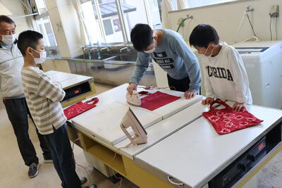 さくら学級では準備が整い、いよいよバックを染めていきます。はじめに不思議な液体を準備。赤色の液体なので、それぞれ「○○みたい~。」と声が漏れます。慎重にバケツに移し替え、みんなの準備したバックをつけこみました。