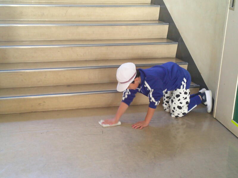 階段掃除。冬季はお湯を使って雑巾がけをしています。