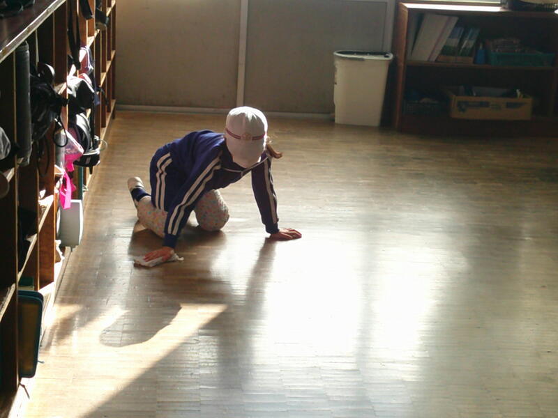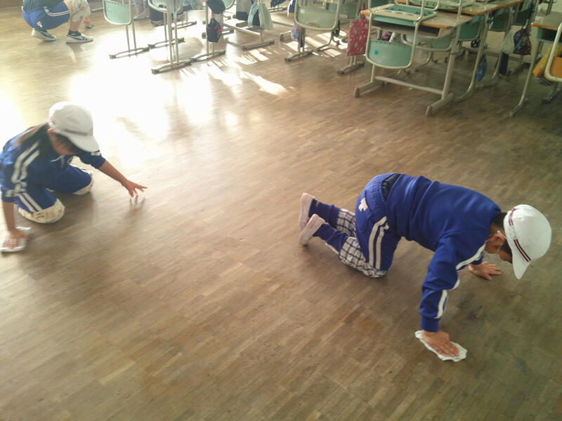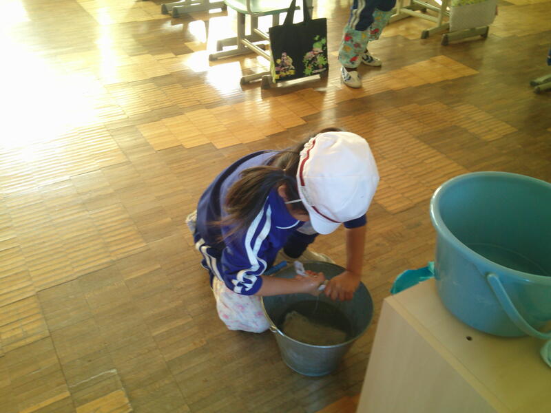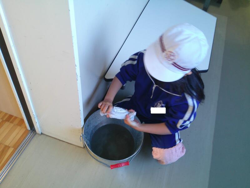 小さい学年の児童も、上級生に教わって、雑巾を上手に絞れるようになりました。