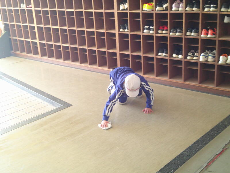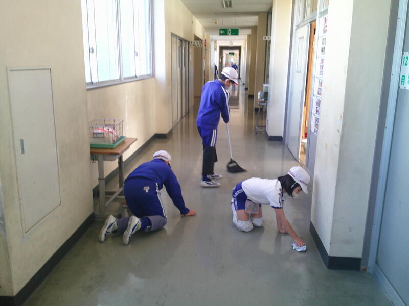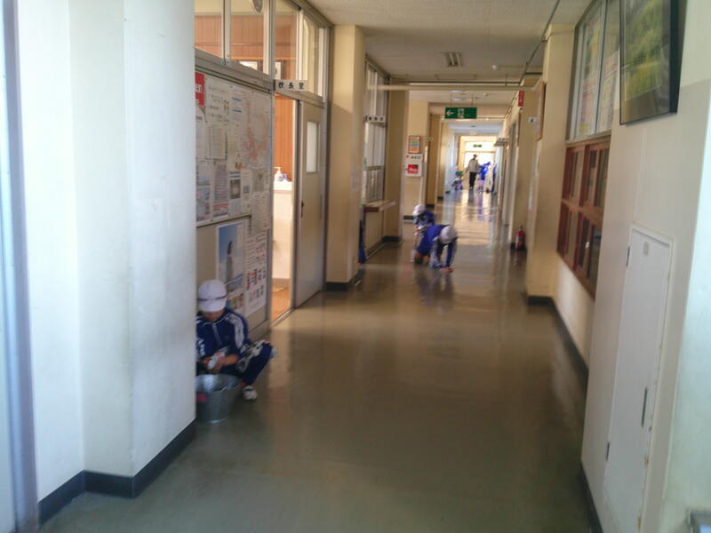 こちらの班は、長い廊下を丁寧に清掃しています。