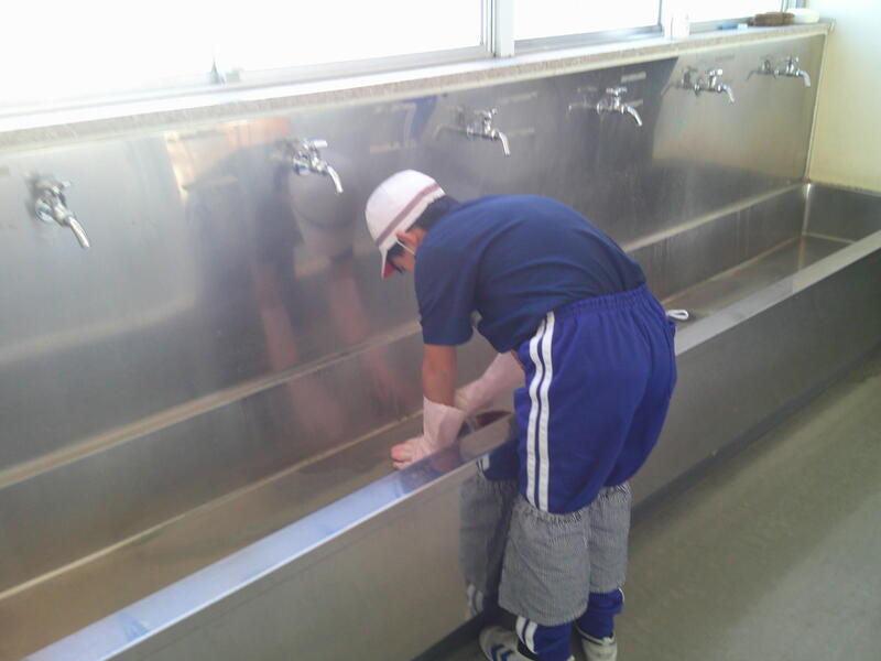 ビニル手袋をはめての水道清掃。お習字や絵の具のセットを使った日は特に念入りに清掃します。