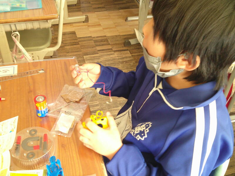 乾電池、プラス極、マイナス極、豆電球、銅線などの言葉や、電気の流れを学習します。