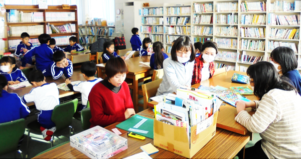 2018年1月18日 10時51分 校庭は周辺しか乾いているところがないため、大休憩に図書室で過ごす子どもたちがたくさんいました。