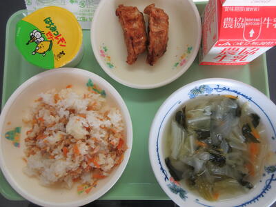 2023年12月7日 12時06分今日の給食は赤井小学校の希望献立でした。メニューは、混ぜ込みツナごはん、牛乳、しそぎょうざ、野菜スープ、はちみつレモンゼリーでした。