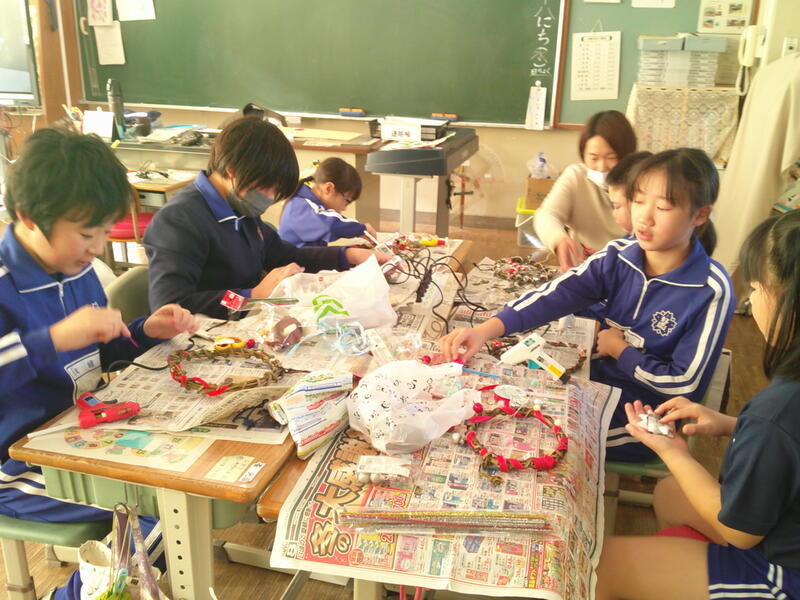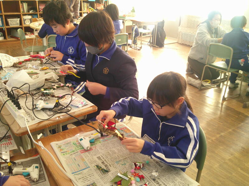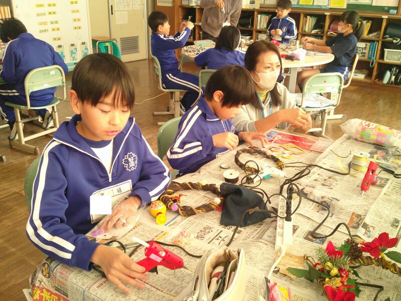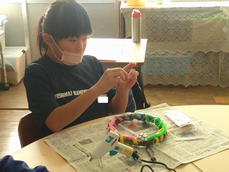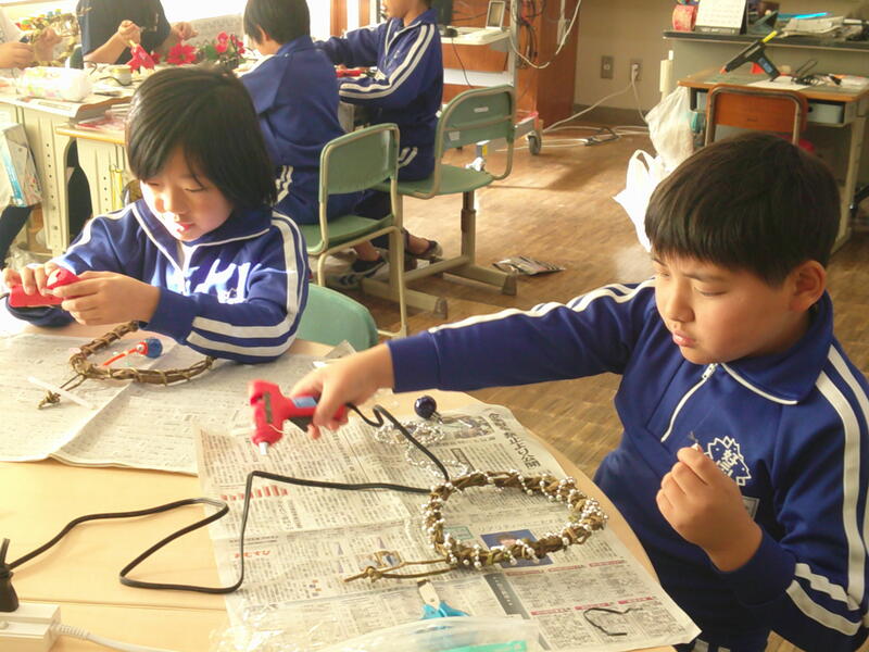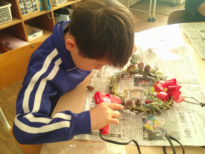 どの材料をどこに置こうかな、どんな色がすてきかな、グルーガンを使っての接着は慎重に、いろいろなことを考えながら、世界にたったひとつのリースを作っていました。