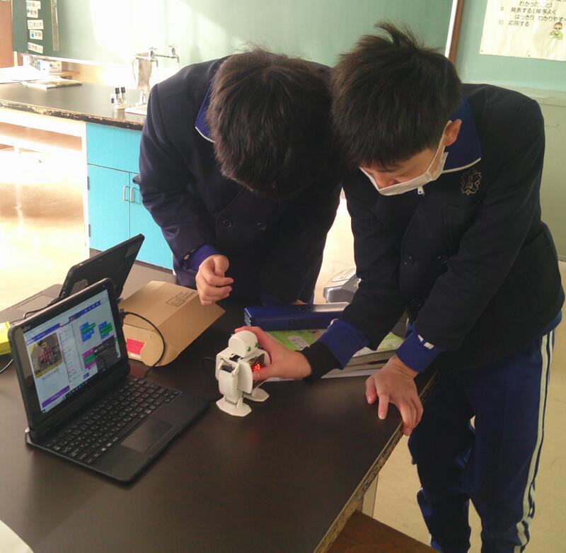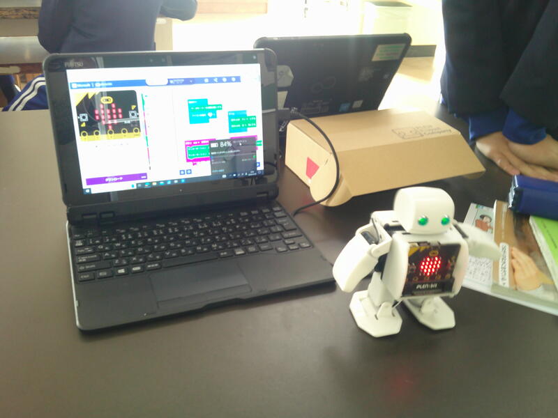 作ったプログラムを、micro:bit(マイクロビット)に送って、ロボットの心臓部にmicro:bitを入れると、光らせたり動かしたりできるのです。