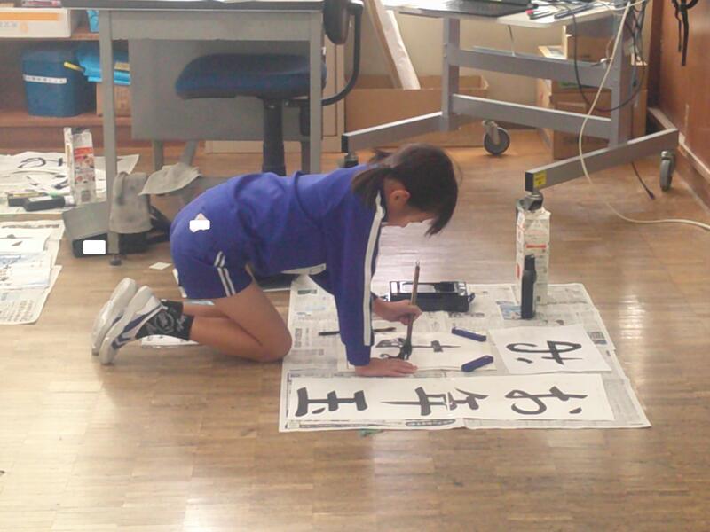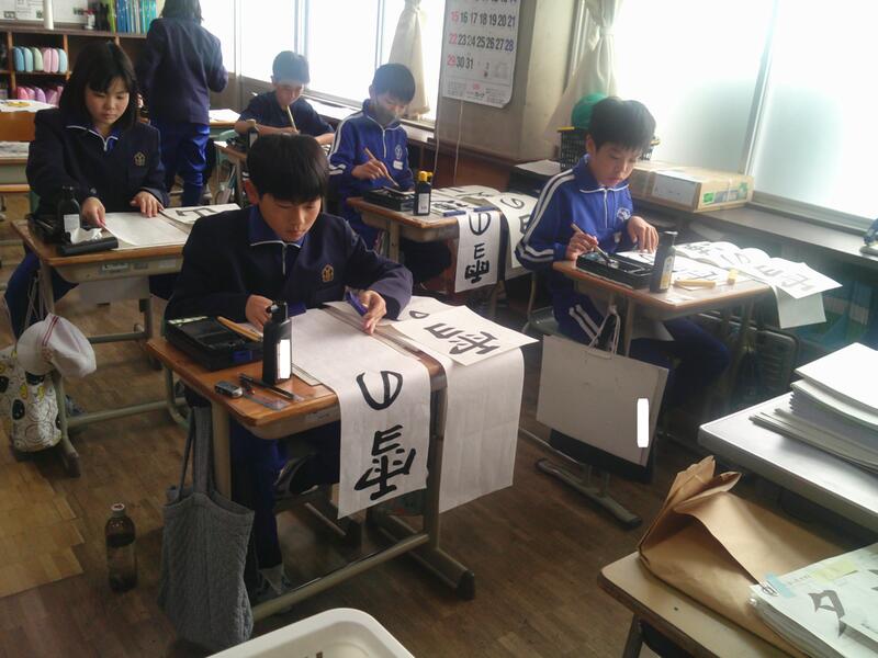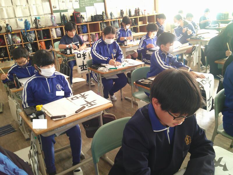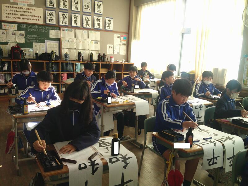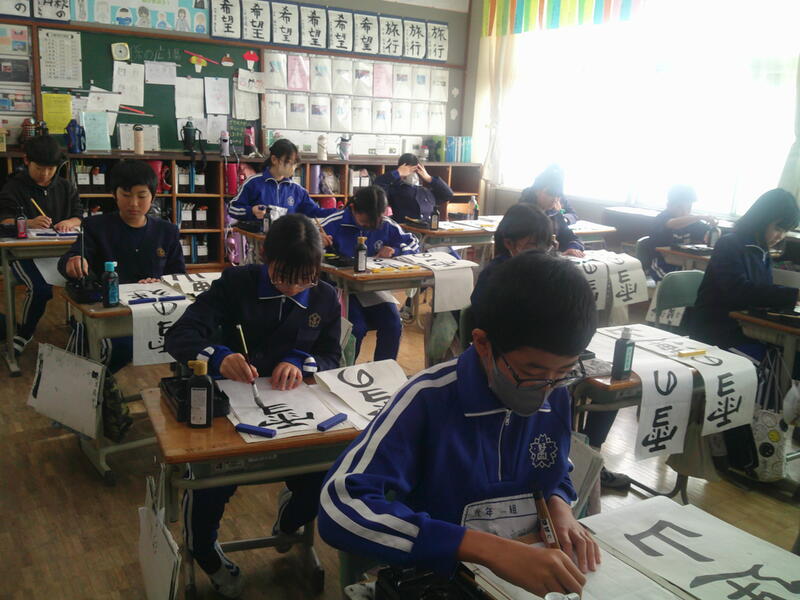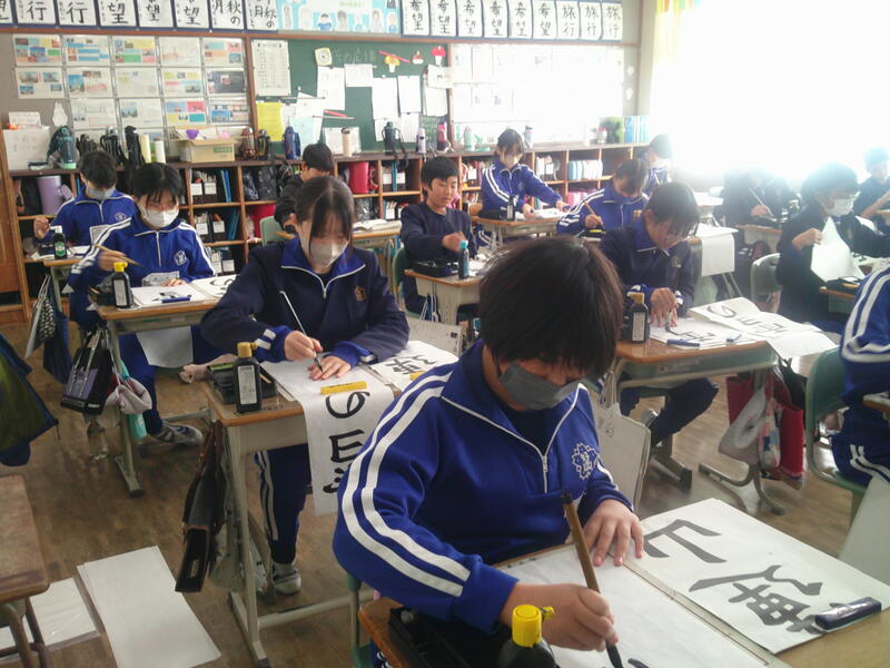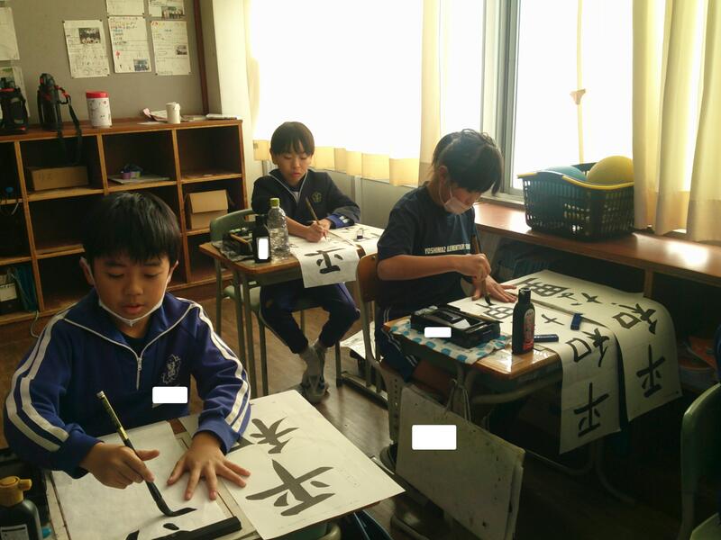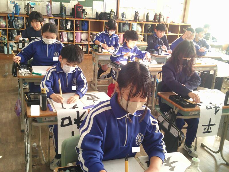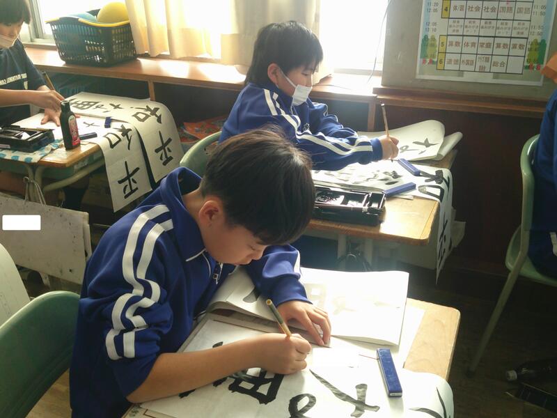 5年教室では、書きぞめの練習。