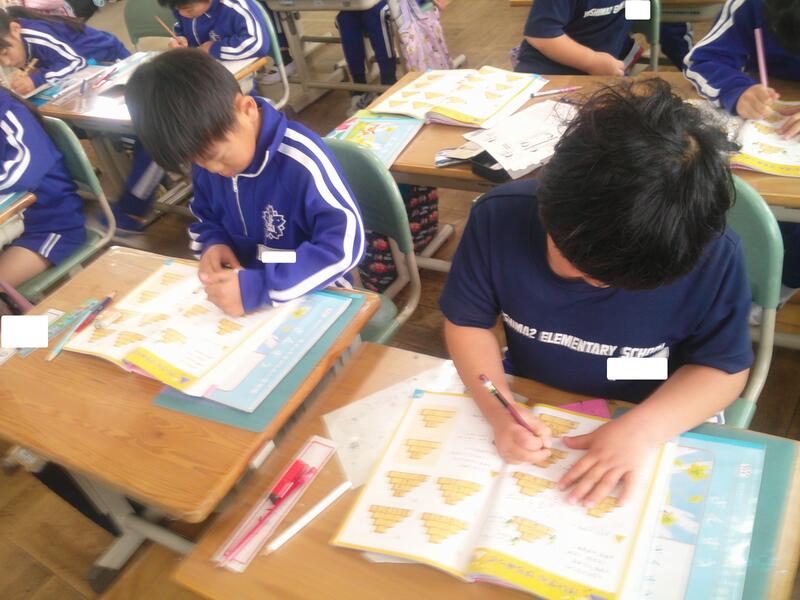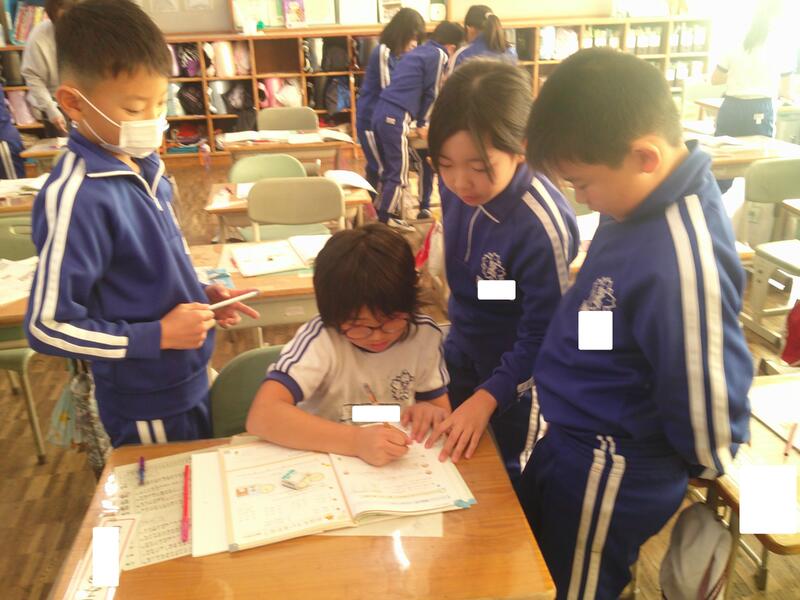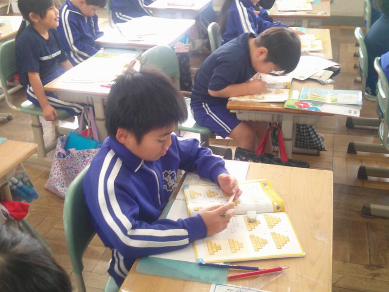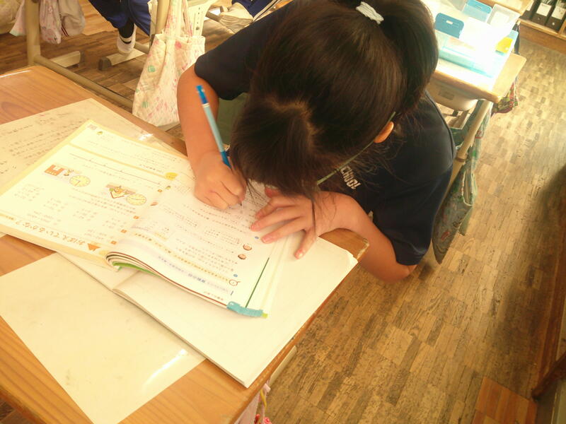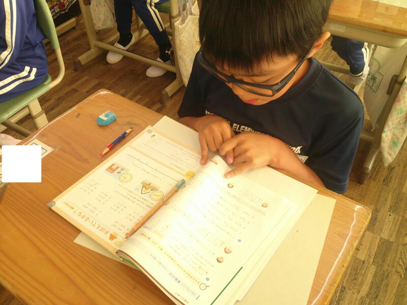 時計をイメージすれば・・・という方もいるのですが、子ども達の身の周りにある時計は、デジタル表示が多いのです。教室の時計を見たり、算数セットの時計を動かしたり、問題用紙の時計に鉛筆で印をつけたりしながら、一生懸命考えています。
