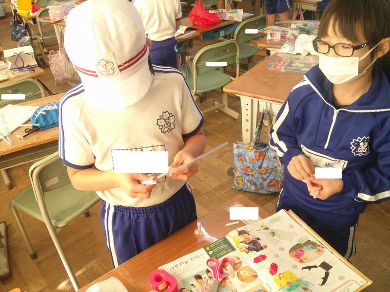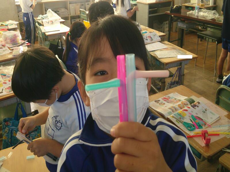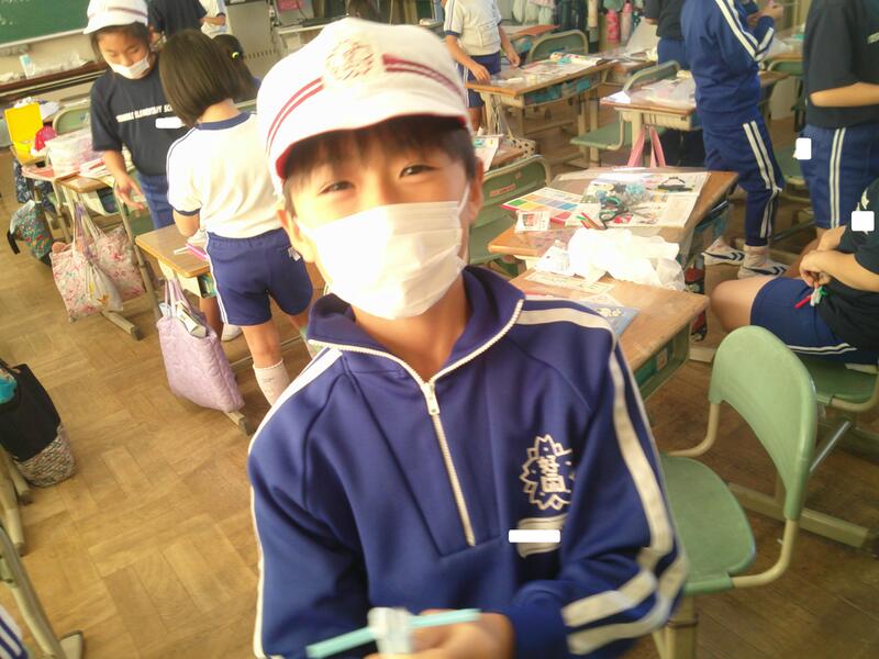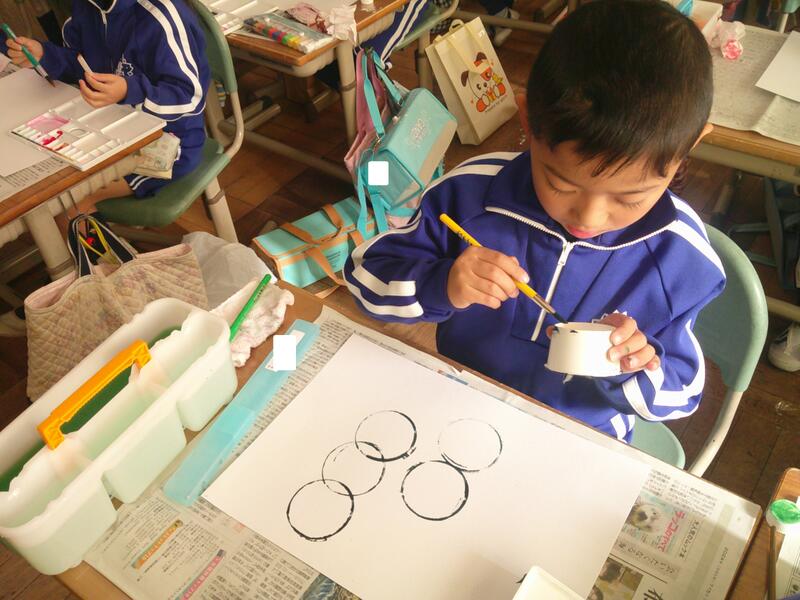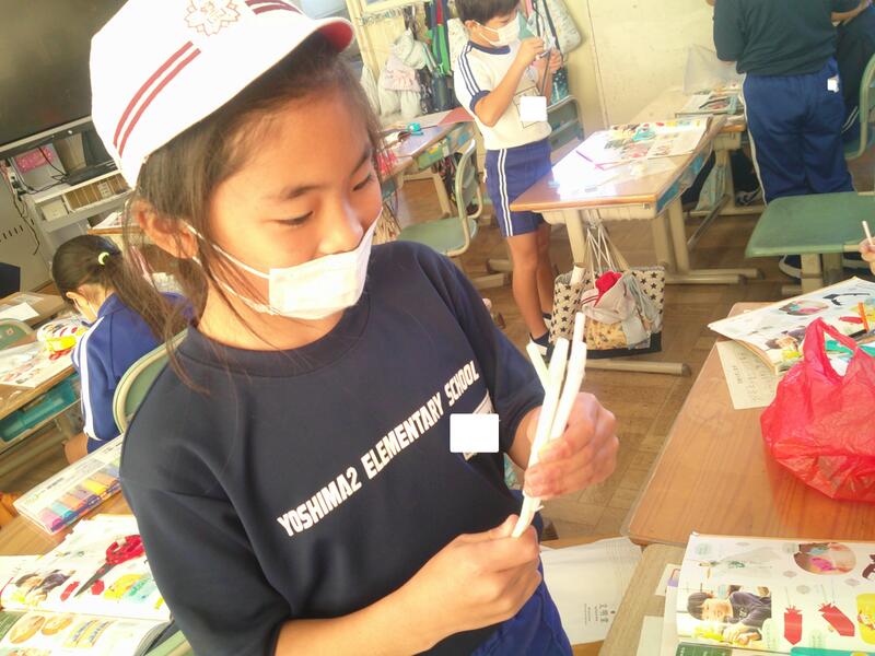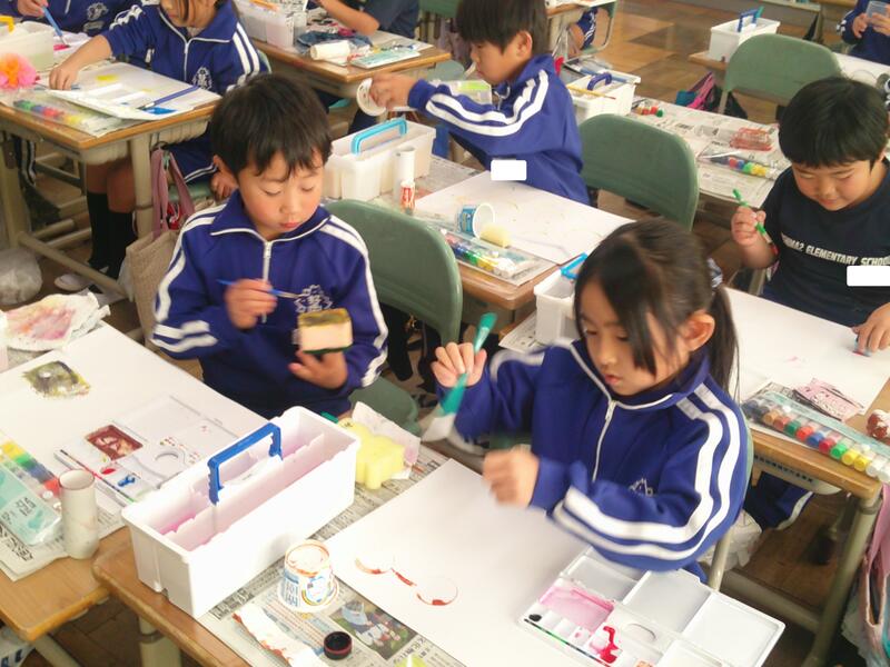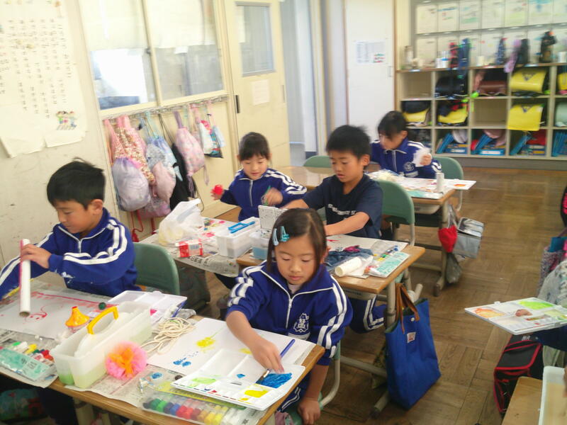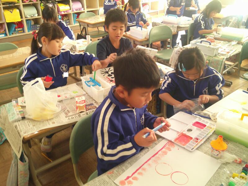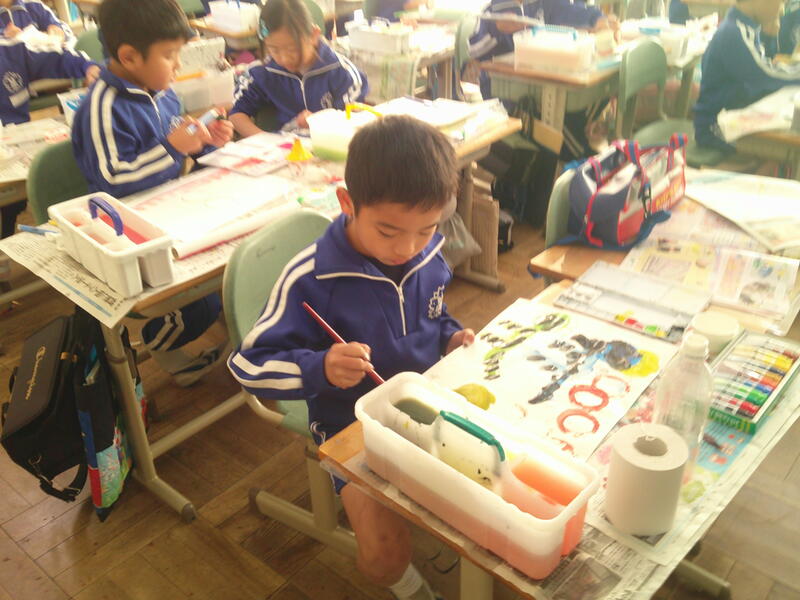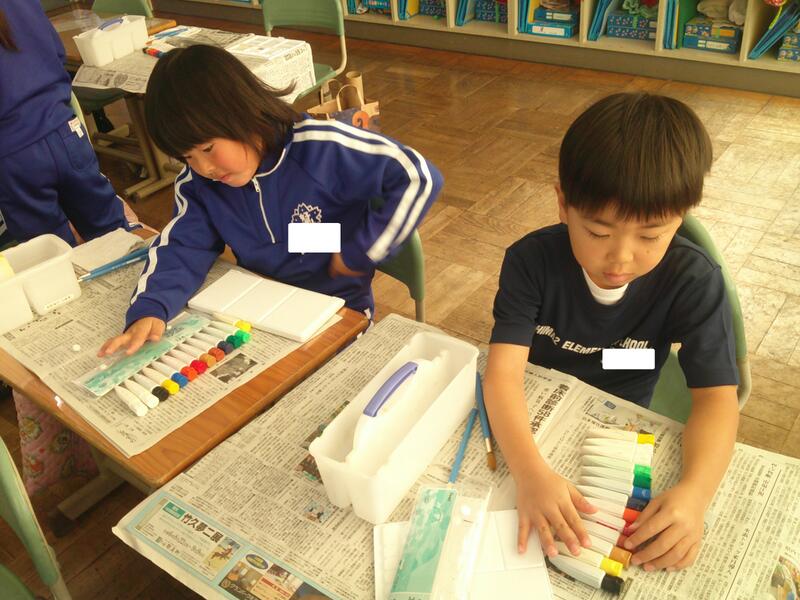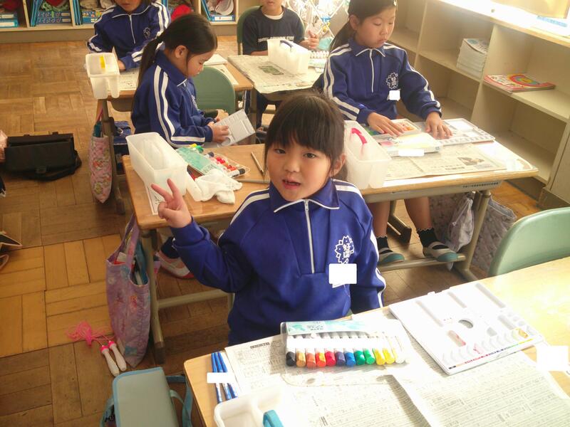 1年生は、2学期から使い始めた新しい絵の具セットがお気に入りです。
