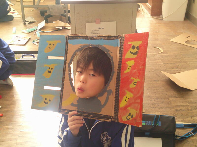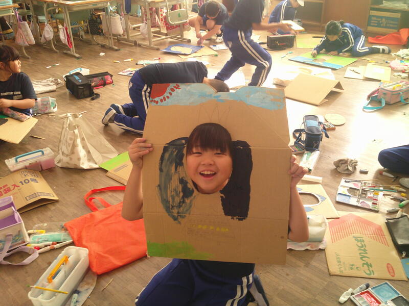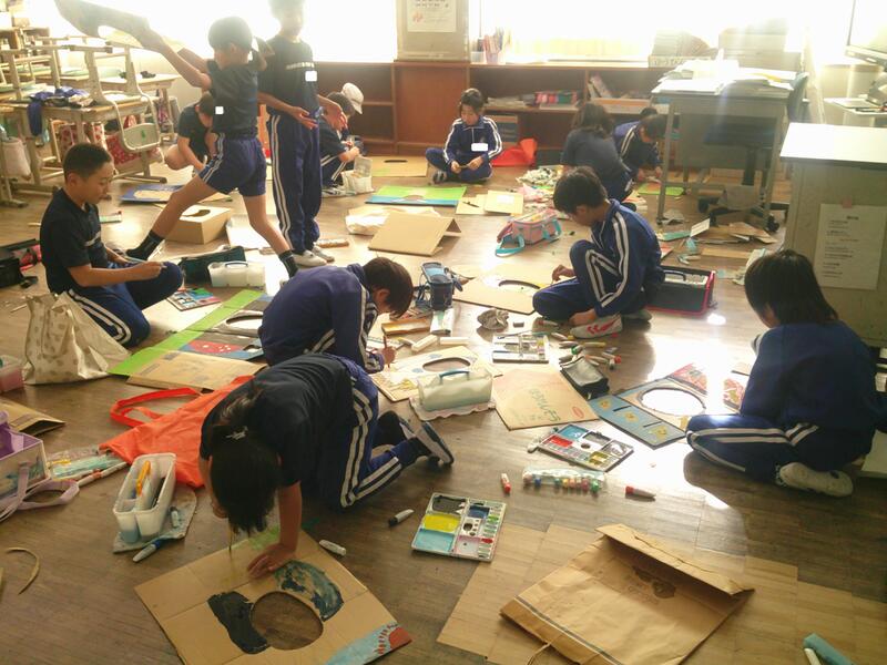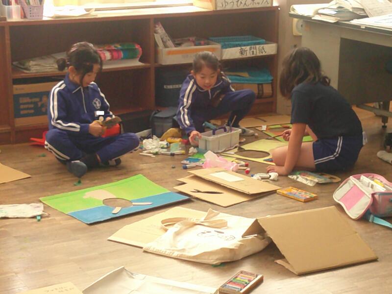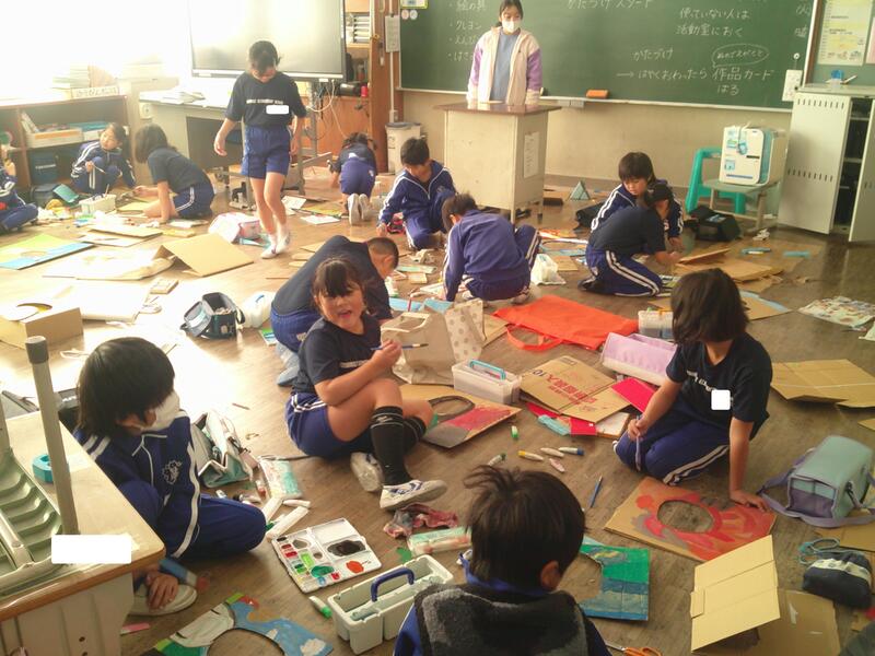 3年生は・・・教室いっぱいにダンボールを広げて活動中。