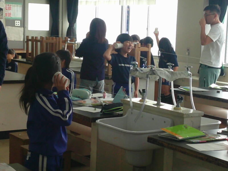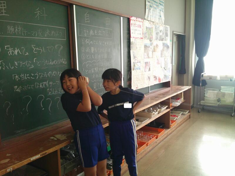 3年2組は、理科。糸電話を使って、音の伝わり方の学習をしていました。