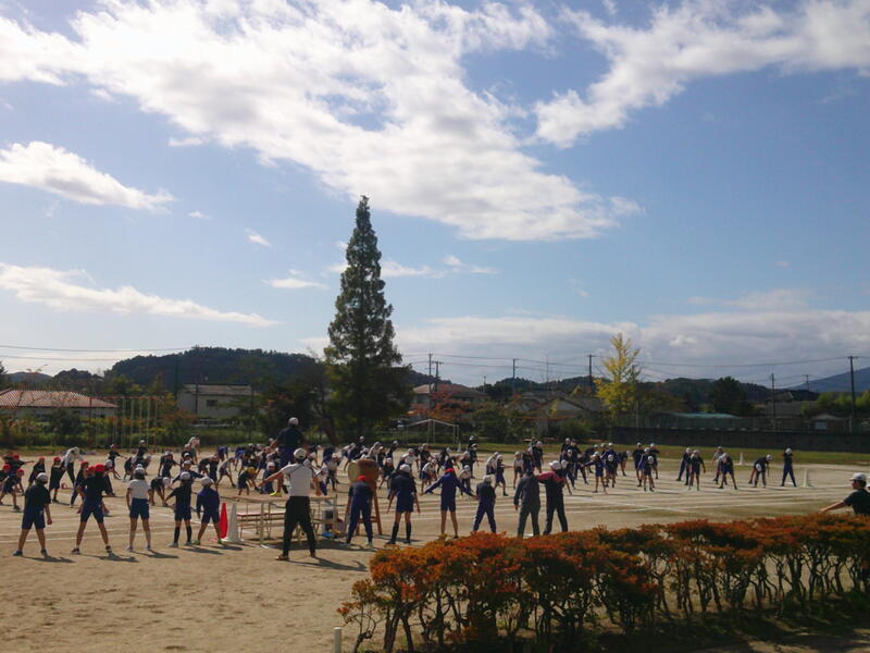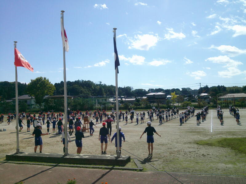 全校生での紅白応援合戦やラジオ体操、それぞれの学年種目、代表児童による紅白対抗リレー。