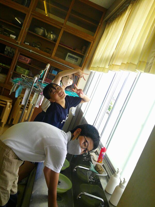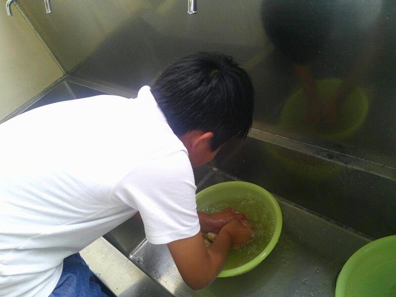初めに先生と確認したので、ほとんどの子はしっかりこすり洗いをしています。ですが中には途中から、水を流したまま洗う子、「これがいいんじゃない?」と軍手を手にはめて手洗いするように洗う子、洗濯機の真似をして軍手を回転し続ける子、そしてお約束の女子に注意を受ける一部男子・・・