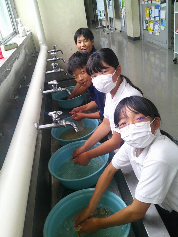 6年生が、水道に一列に並んでなにやら活動中。