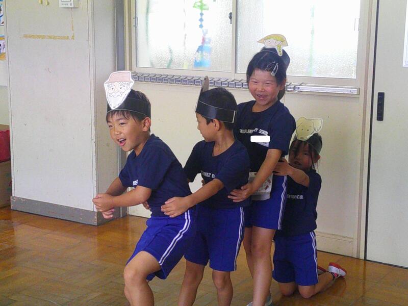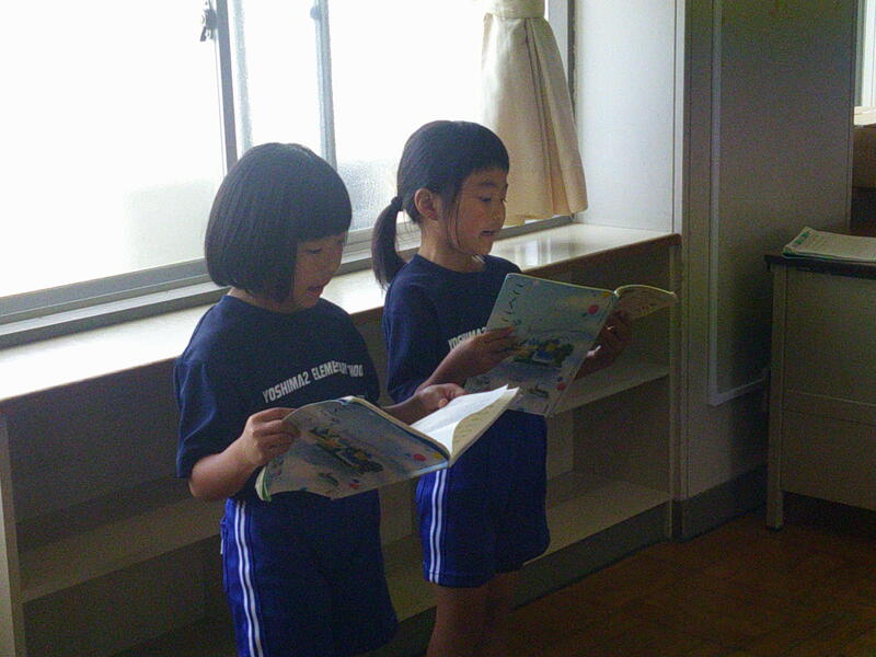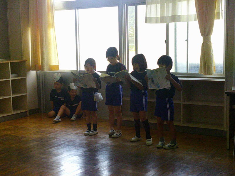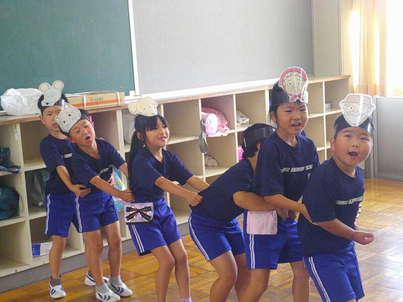 1年生が、国語で「おおきなかぶ」の音読劇をしていました。先生の作ってくれたお面ひとつで、子ども達はあっという間に役になりきります。