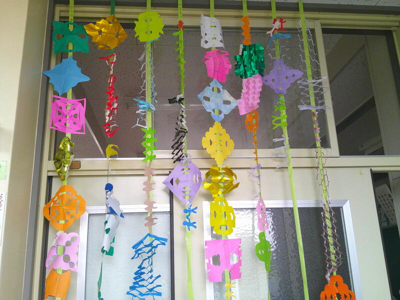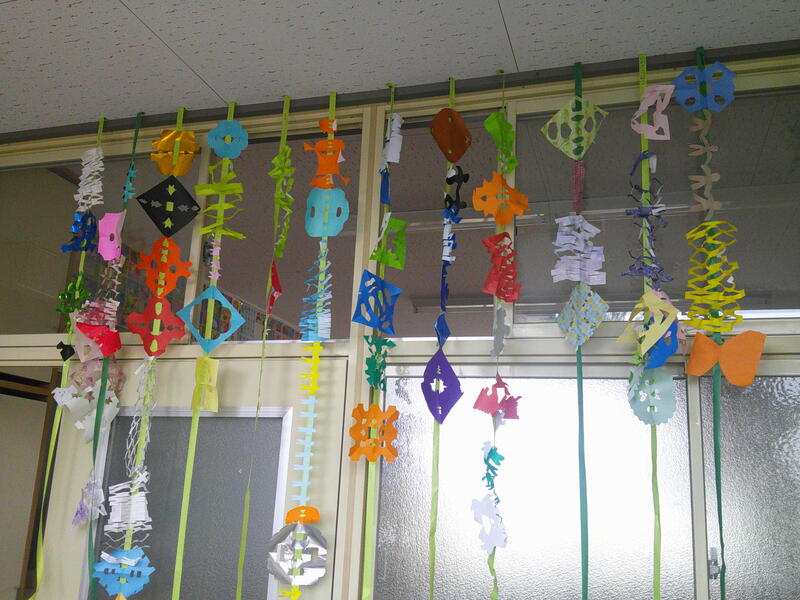 1年生が先週の授業参観でお家の人と一緒に取り組んだ折り紙飾りは、廊下にきれいに飾られていました。