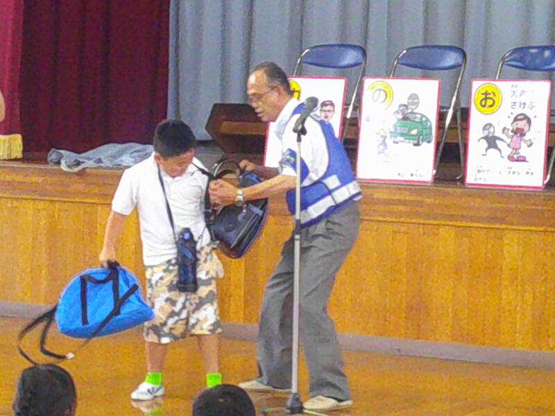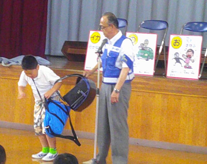子ども達は、登下校時、ランドセルと水筒を毎日身につけています。万一不審者にランドセルを捕まれた場合、①ランドセル②水筒、の順で身につけると、ランドセルが水筒にからまって、どんどん引っ張られてしまいます。
