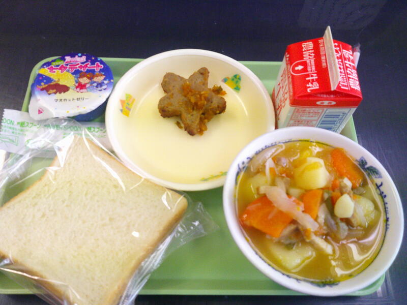 今日は季節の給食です。七夕にちなんだ星形のハンバーグやゼリーがでました。