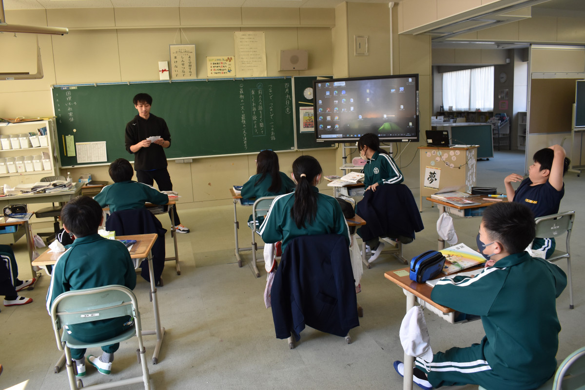 この日の午後、好間中学校で体験入学を行いました。はじめに中学校の授業の様子を参観しました。真剣に学習に取り組む先輩たちの姿を目にし、子どもたちは自然と背筋が伸び、引き締まった表情でその雰囲気を感じ取っていました。続く6時間目には、英語科の体験授業を受けました。中学校の先生の問いかけに、戸惑いながらも一生懸命に応えようとする姿が見られるなど、普段の教室とは違った緊張感のある授業となりました。