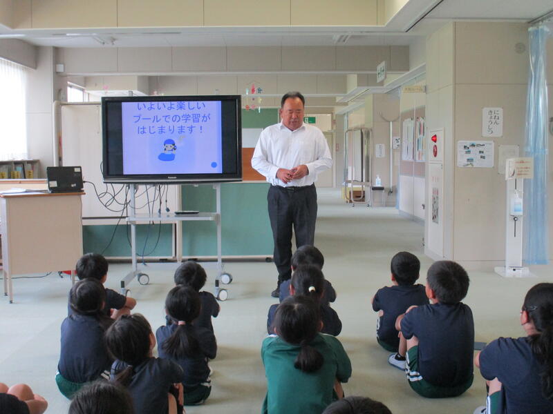 2024年6月6日 10時49分今日は全校生でプール開きを行いました。各学年の代表児童が、今年の目標を発表し、その後、担当の先生から注意事項がありました。プールの状態は、水が入り、塩素濃度もばっちりです。後は、気温と水温が上がってくるのを待ちたいと思います。