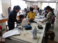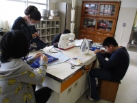 5年生の家庭科では、ナップザックつくりをしています。ミシンを使って縫い上げていく様子は真剣そのもの。