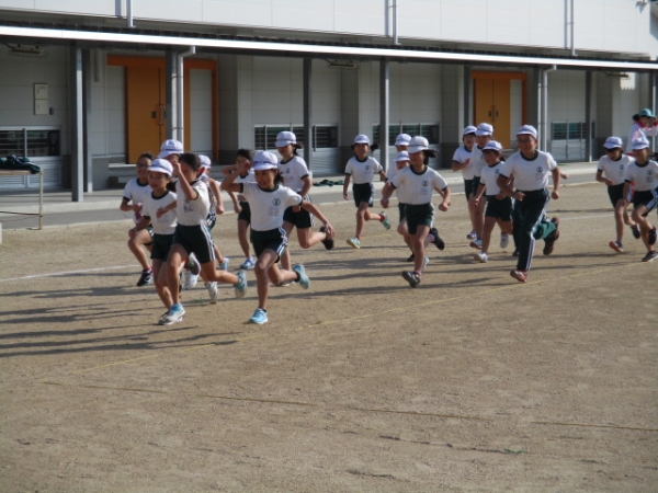 そんな中、子どもたちは登校後の朝の時間と休み時間、体育の時間を使って持久走の練習に励んでいます。今日は、体育の学習のある学年は、全学年持久走の練習をしました。