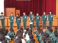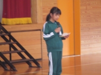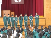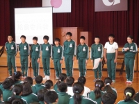 代表委員長のあいさつの後、放送委員会、図書委員会、体育委員会、保険委員会、給食委員会、ボランティア委員会の各6年生が代表で紹介しました。